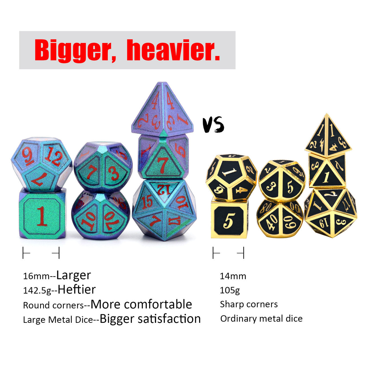 - Excellent heft metal dice with great rolling feel.