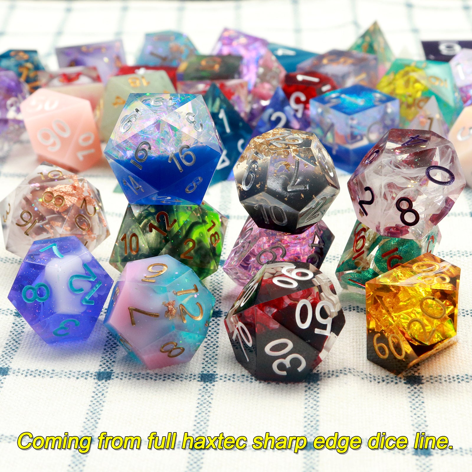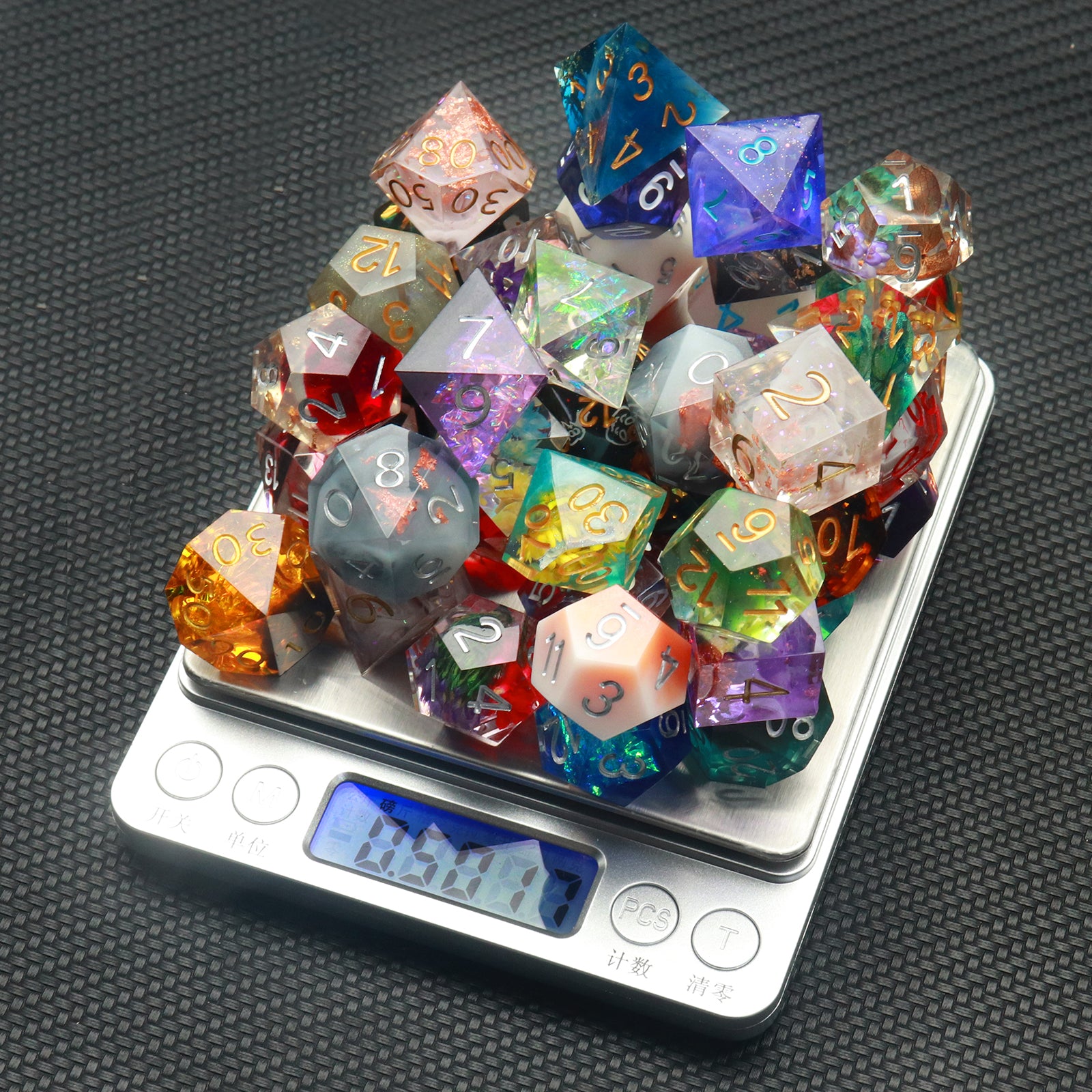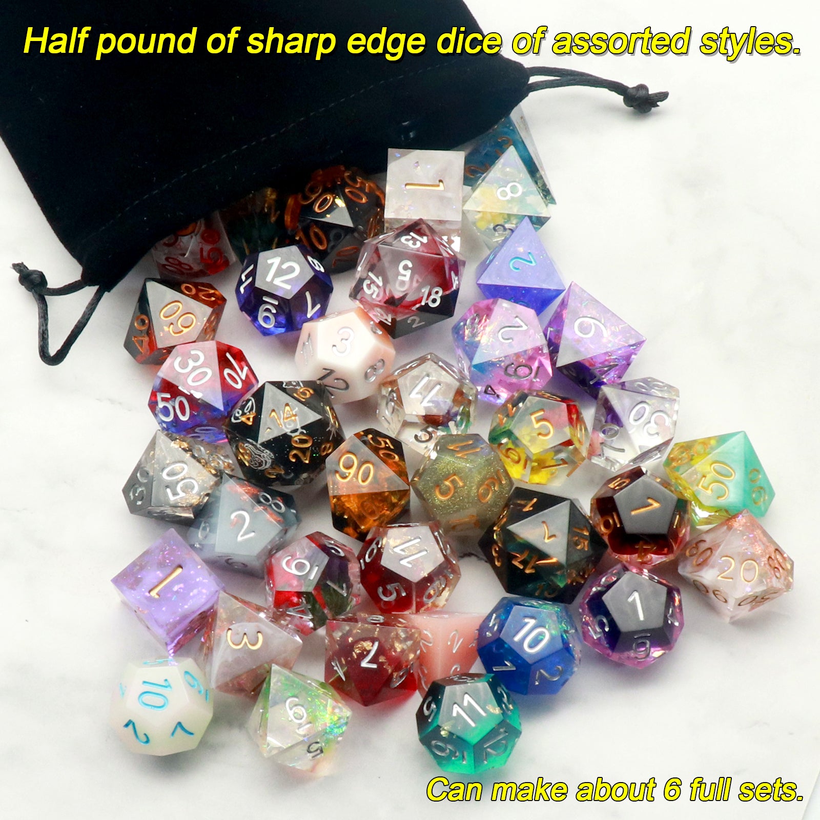 Update: We are now offering half pound assorted sharp edge dice as well! They are made by hand with resin through the whole procedure. Half a pound is about 6 sets in total.