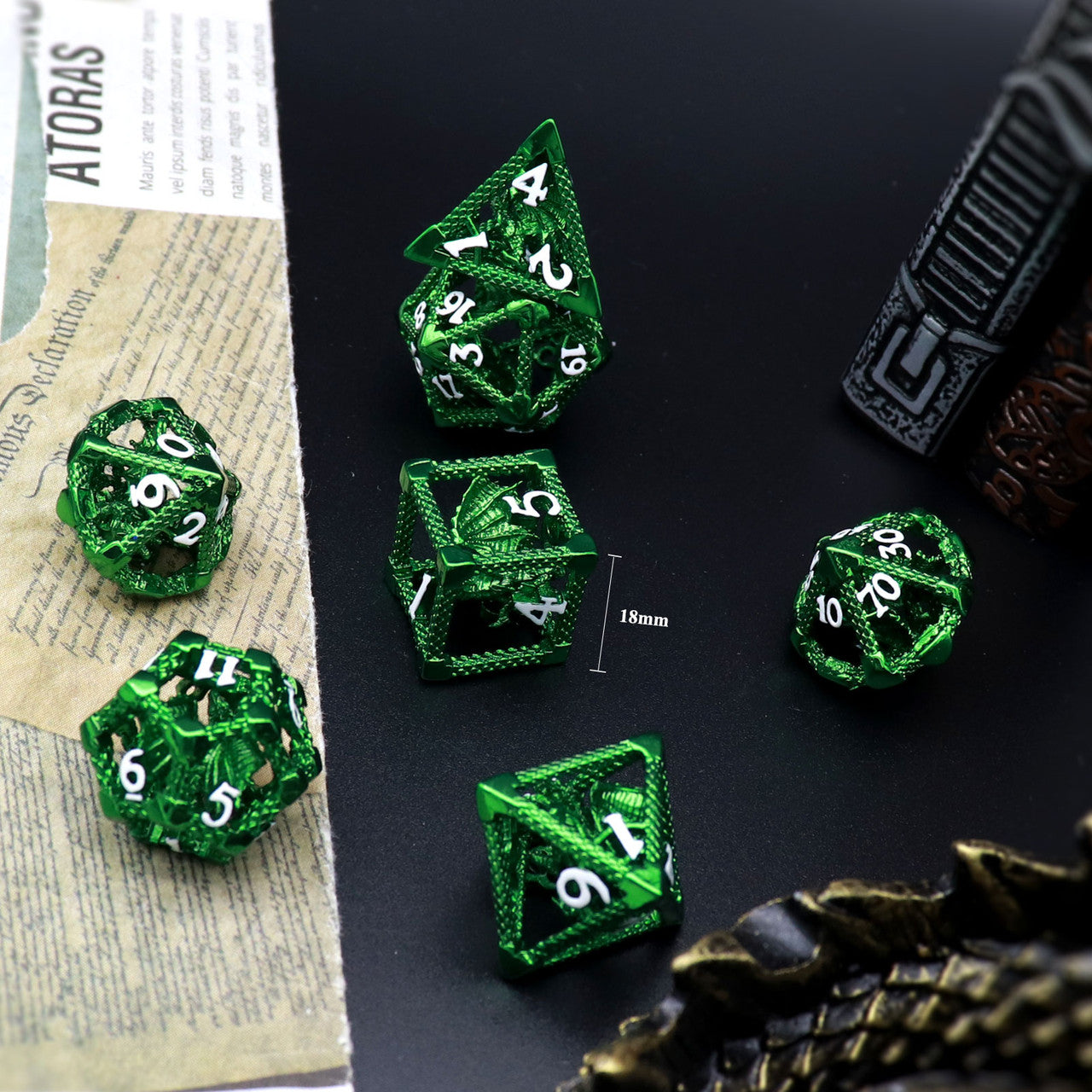 Haxtec Hollow Dragon Metal DND Dice Set With Leather Dice Bag for Dungoens and Dragons RPG Gift Green Dragon