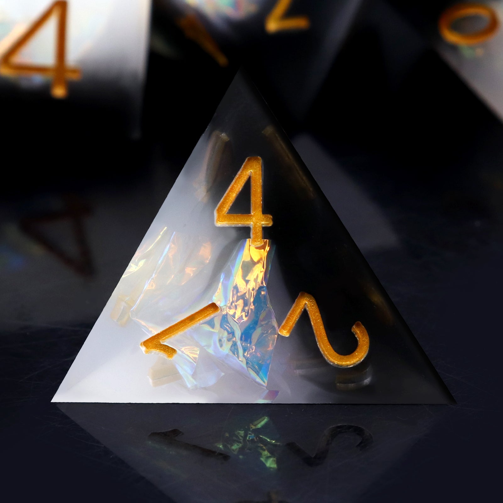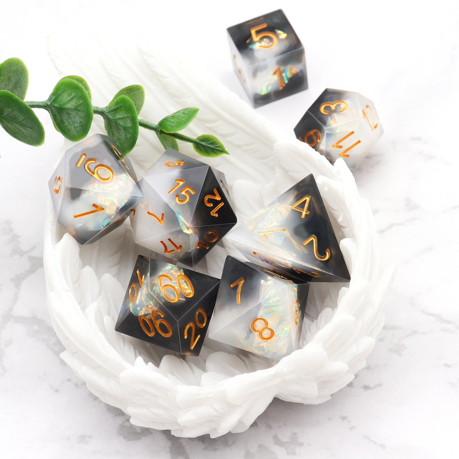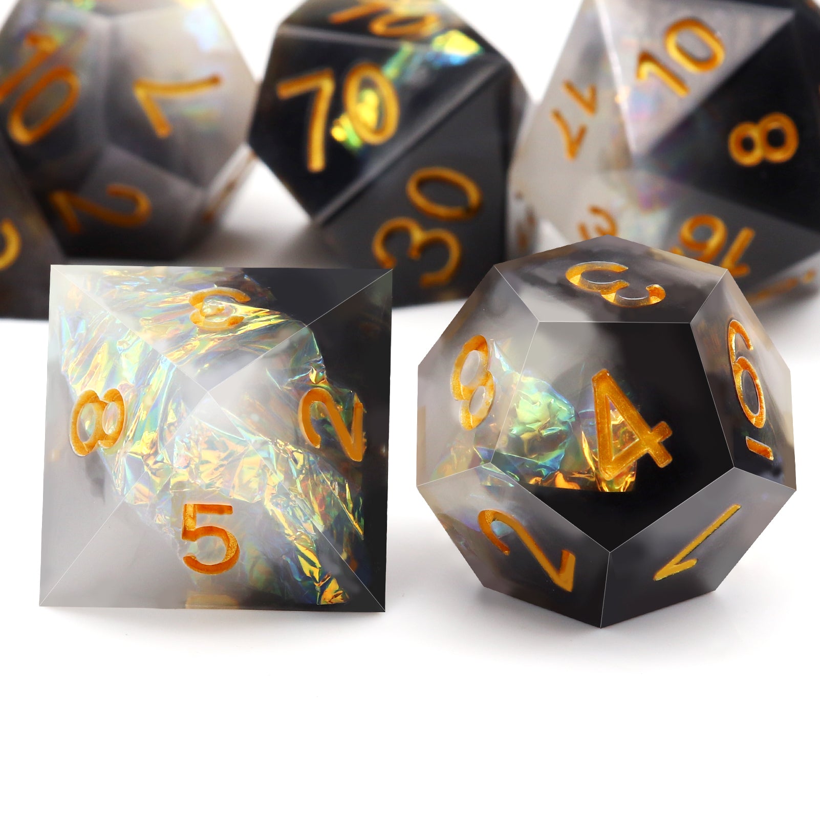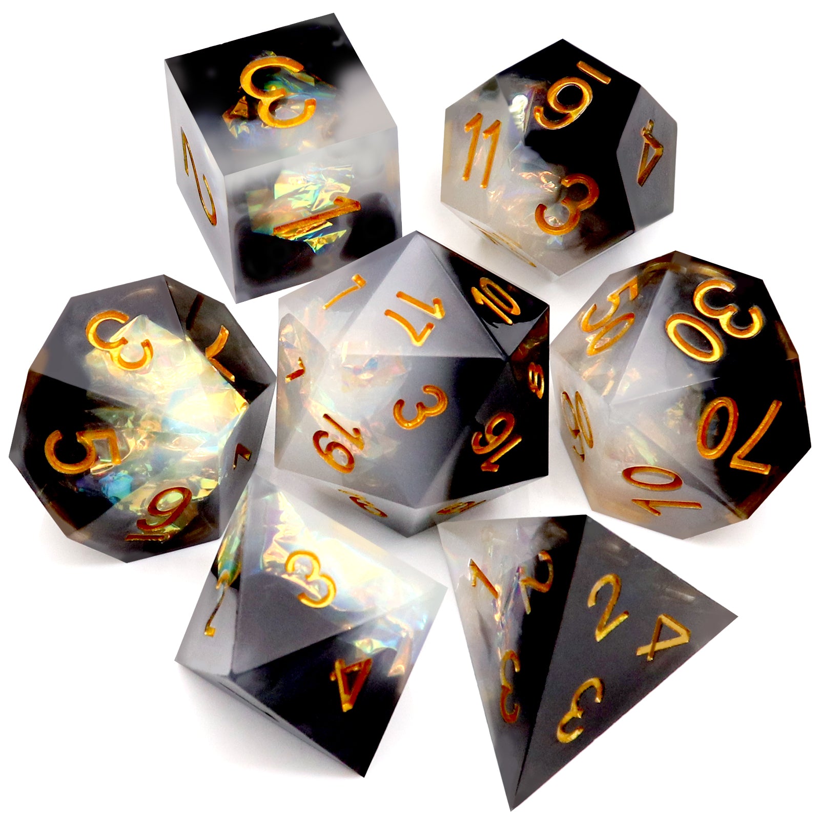 - Sharp Edge Dice With Mirror Look: 7PCS resin rpg dice set with sharp edges and mirrior level smooth surfaces.
