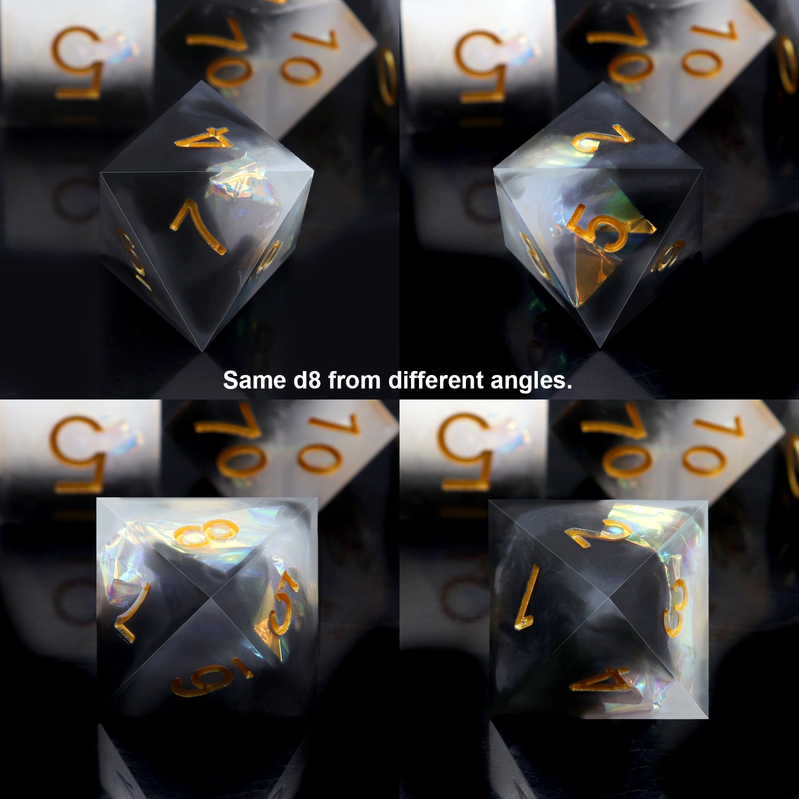 - Handmade Galaxy Dice: The Galaxy series features sharp edge dnd dice displaying scenes of splendid cosmos when traveling between stars. All polyhedral dice are crafted by our experienced resin aristists and hand picked to be visually perfect before shipping. Surfaces are polished to be mirror. As they are handmade, each set will vary slightly in color proportions and inclusion placement.