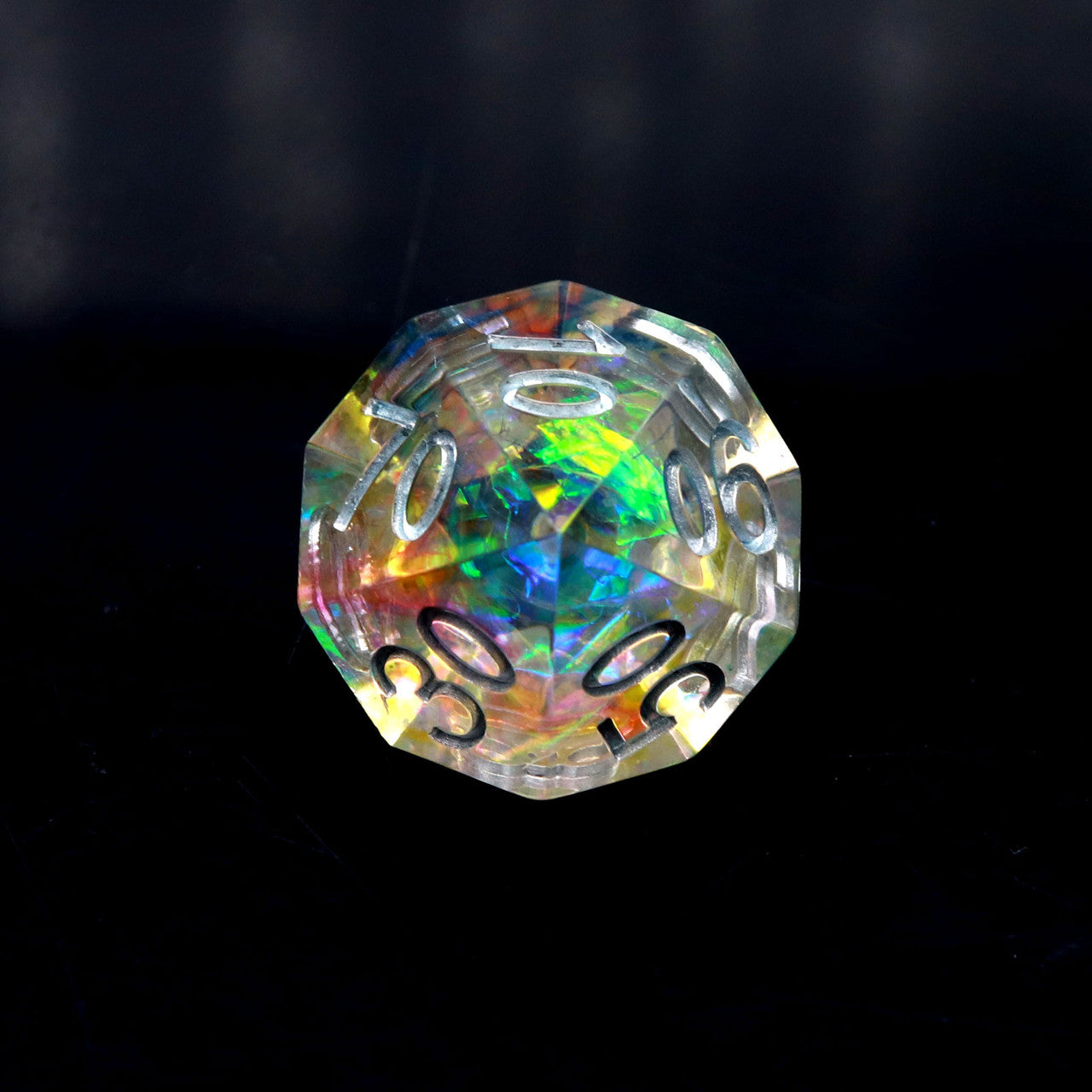 Venture into uncharted territories with the Celestial Mirage dice set, where the sky meets the earth in a mesmerizing display of color. As you roll these dice, watch as the iridescent mylar within the resin creates a spectacular mirage of clouds and sky. Use them in your Dungeons and Dragons adventures to add a touch of celestial magic to your game, and let the unpredictable nature of these dice take you on a mystical journey.